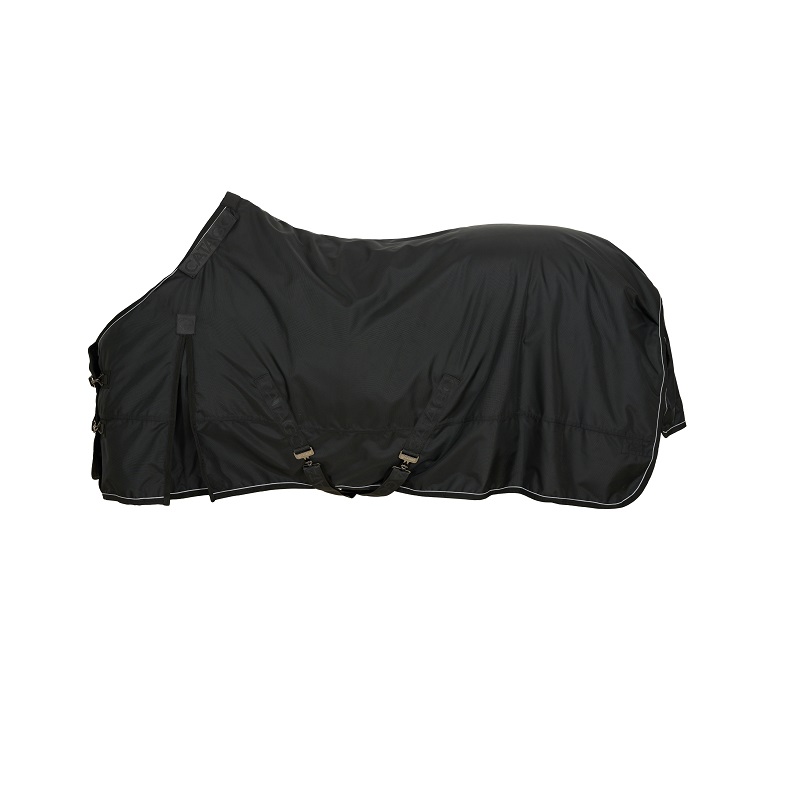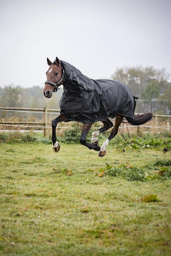 De deken heeft een dubbele verstelbare voorsluiting met clip hooks en D-ringen, plus schouderplooien voor extra ruimte bij bewegen. De kruissingels en elastische beenriemen houden alles netjes op z’n plek. En de extra grote staartflap geeft achter extra bescherming tegen wind en regen.
