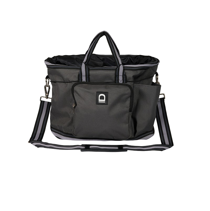 De tas sluit met zachte zwarte polyester stof en een koord met stopper. Handig tegen stof en rommel in de zadelkamer, en fijn wanneer je de tas meeneemt in auto of trailer. Dankzij de gestreepte webbing handvatten en de verstelbare schouderband draag je ’m gemakkelijk van poetsplaats naar trailer of ring.