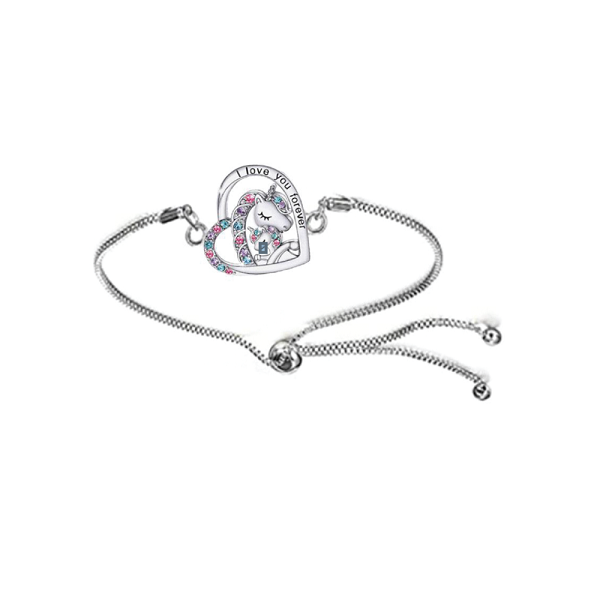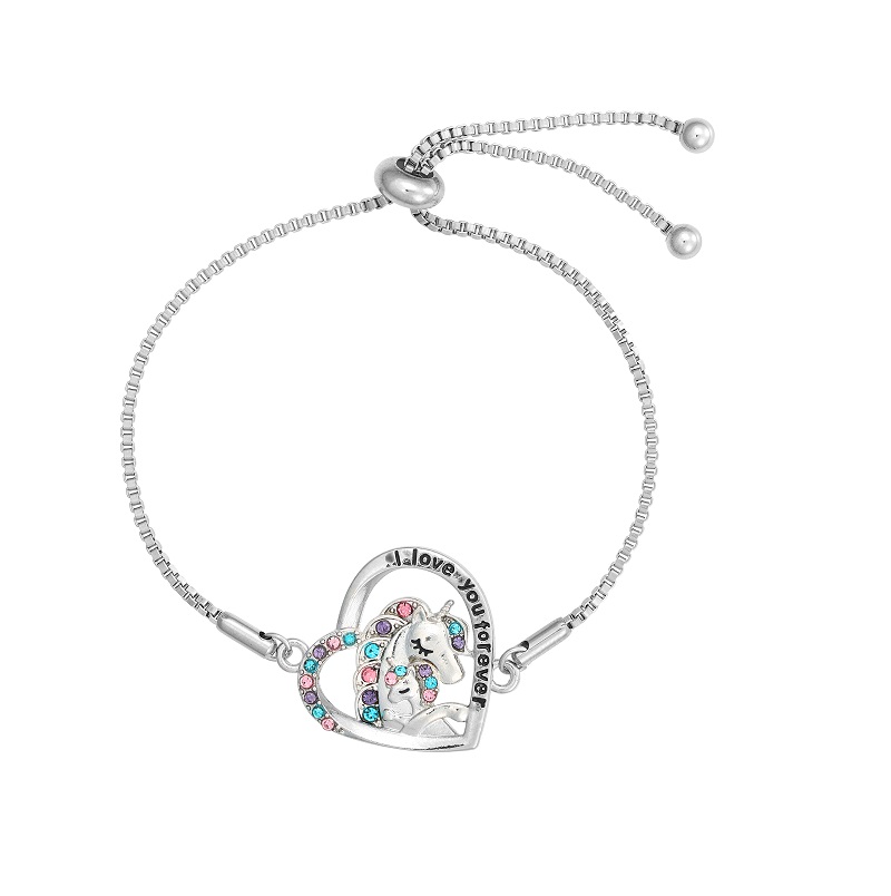 De Equipage Unicorn armband voor kinderen in het zilver is een fijne kinderarmband met hartvormige unicorn-hanger, ingelegd met kleurrijke rhinestones en de tekst “I love you forever”. Nickelvrij, verstelbaar en perfect als cadeautje voor pony- en unicornfans.