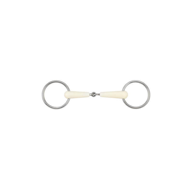 De Happy Mouth Bit enkelgebroken watertrens is een fijne keuze voor ruiters die een klassiek los-ring bit zoeken, maar dan in een wat mondvriendelijker materiaal. Dit model heeft een enkelgebroken mondstuk, wat betekent dat het bit bij aanname een duidelijke en directe inwerking geeft op tong en lagen, met het bekende V-effect van een enkelgebroken bit. Dit type mondstuk kan druk geven op gehemelte, lagen en tong.