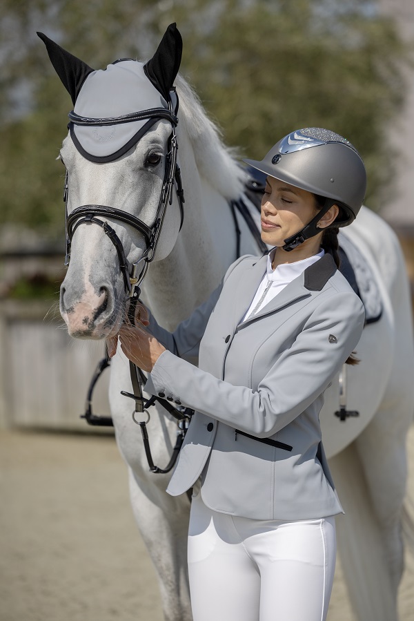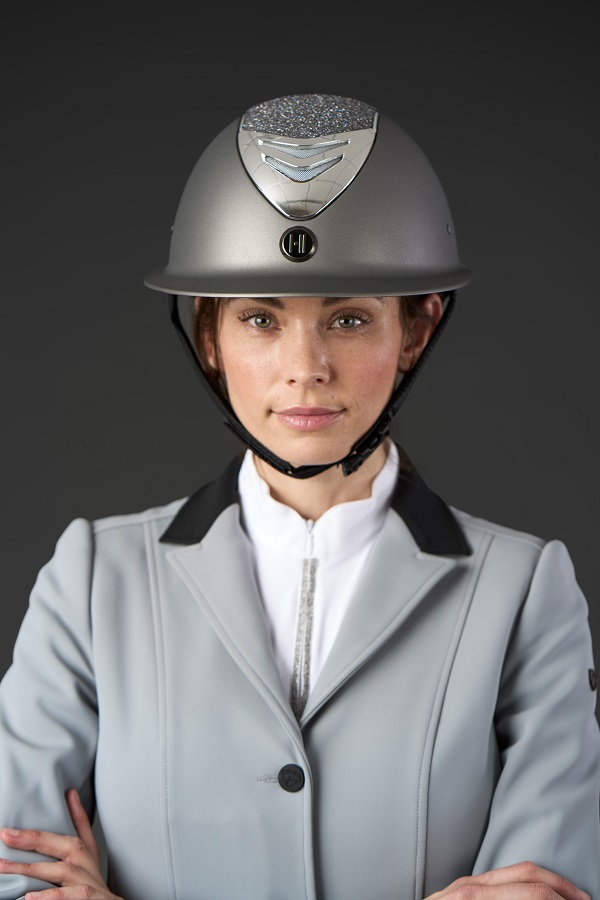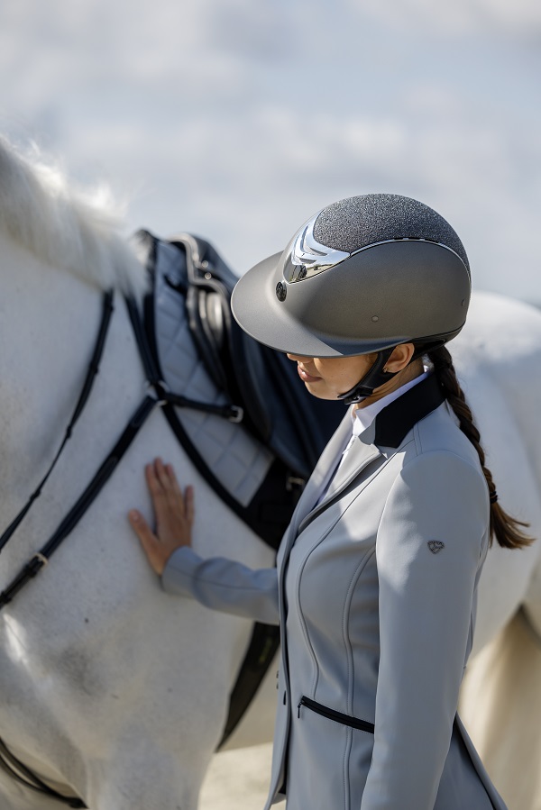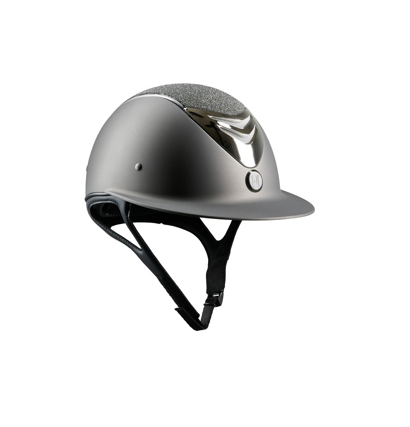 De OneK Avance MIPS cap in mat grijs combineert een chique, moderne uitstraling met extra veiligheid. De mat grijze schaal, glitter top, chrome front en rail en geïntegreerde MIPS-technologie maken dit een luxe cap voor ruiters die stijl en veiligheid willen combineren.
